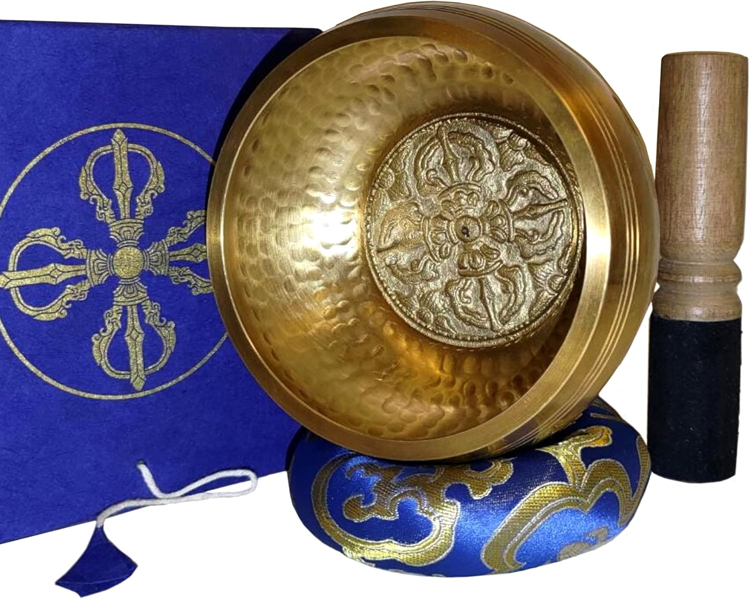 - Set: Contiene una campana tibetana di meditazione (Ø ≈ 12 cm), un battente di legno pregiato rivestito in pelle da un lato, un cuscinetto ricamato e cucito a mano in seta blu e una scatola di carta Lokta blu anche questa fatta a mano.
